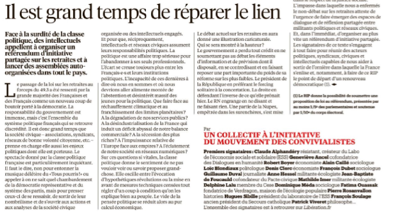 L’impasse dans laquelle nous a enfermés le non-débat sur les retraites (et, donc, entre autres, sur le statut du travail) atteste de l’urgence de faire émerger des espaces de dialogue et de réflexion partagée entre militants politiques et réseaux civiques. Et, dans l’immédiat, d’organiser au plus vite, par exemple, à partir de cette question devenue si centrale, un référendum d’initiative partagée. Les signataires de ce texte s’engagent à tout faire pour réunir des acteurs politiques, syndicaux, civiques et intellectuels capables de nous aider à sortir de l’ornière dans laquelle la France s’enlise et, notamment, à faire de ce RIP le point de départ d’un renouveau démocratique.